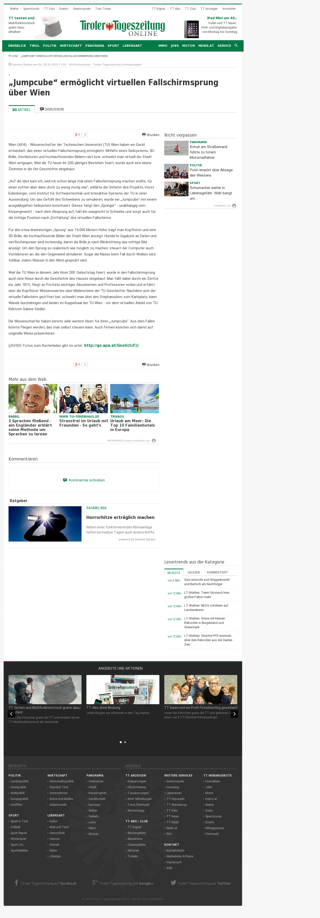 | Tiroler Tageszeitung | „Jumpcube“ ermöglicht virtuellen Fallschirmsprung über Wien May 28, 2015 | VirtualJumpSimulator | Screenshot |